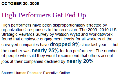 I often describe the necessity for organization renewal to occur routinely in business to build the drive within employees to innovate and customers to advocate. 2010 demands Uber-renewal strategies. I’ve seen some of the lowest employee engagement scores since the days of Roman slavery over the past few months. Some scores well below 20% engagement. Most are hanging on to their existing jobs just long enough to move on to other opportunities.